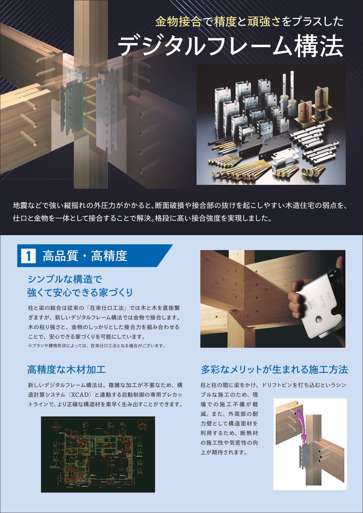 地震などで強い外圧力がかかると、断面破損や接合部の抜けを起こしやい木造住宅の弱点を仕口と金物を一体として接合することで解決。格段に高い接合強度を実現しました。